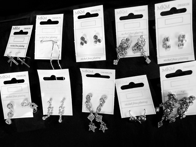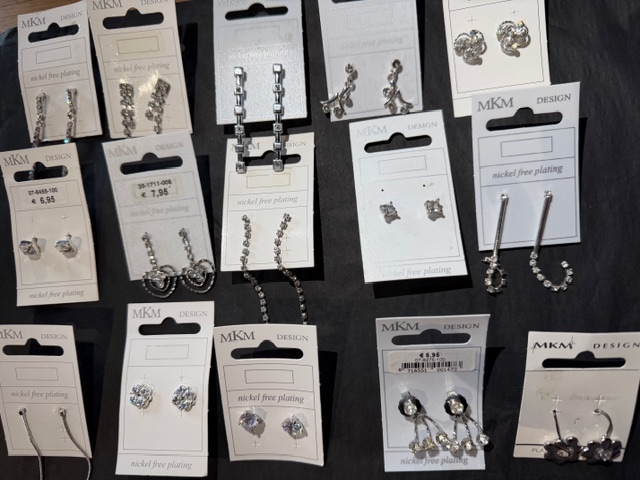 12 paar oorbellen rond met strass oorstekers op een display...