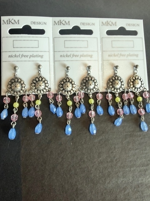 3 paar oorbellen met prachtige combinaties van zachtroze, limoengele en helderblauwe kraaltjes.