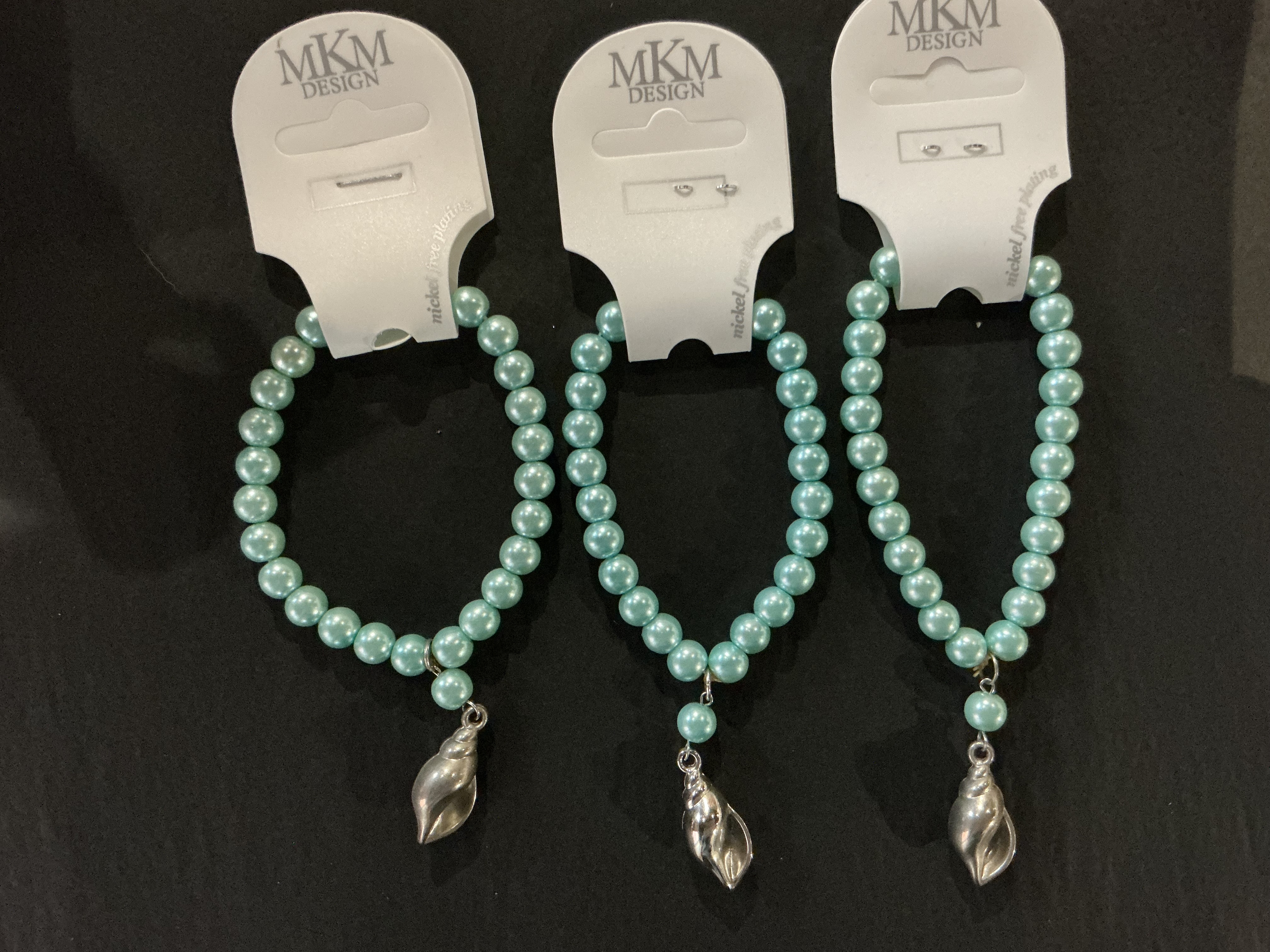 3 prachtige armbanden met parel en een hangertje in de vorm van een schelp de armbanden zijn rekbaar...
