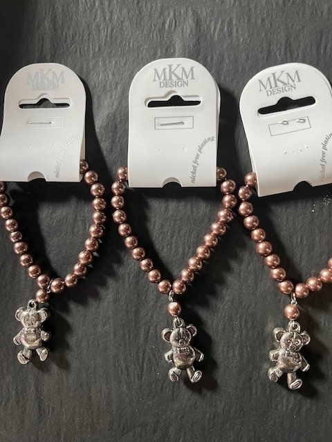 3 prachtige armbanden met parel in de kleur bruin en een hangertje in de vorm van een beertje de armbanden zijn rekbaar.