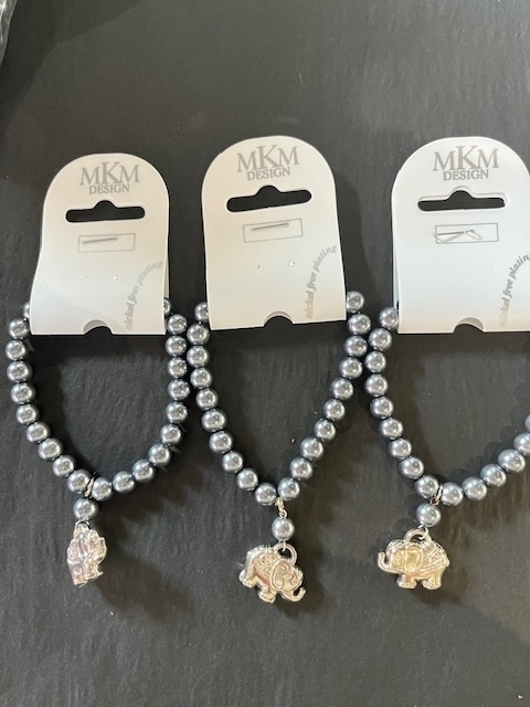 3 prachtige armbanden met parel in de kleur grijs en een hangertje in de vorm van een olifantje de armbanden zijn rekbaar.