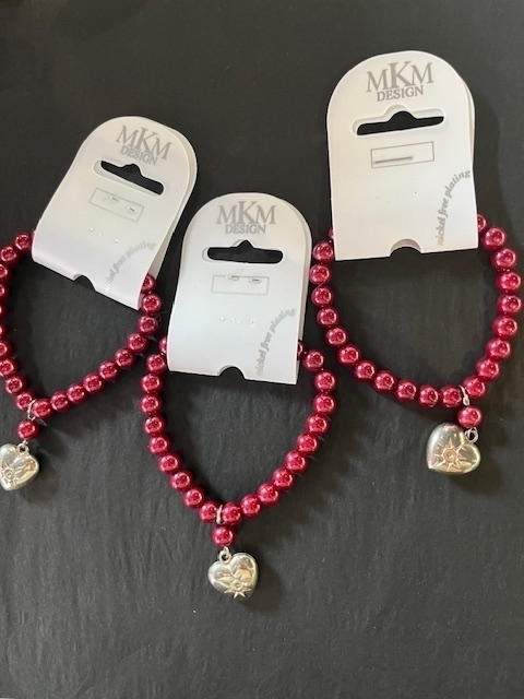 3 prachtige armbanden met parel in de kleur rood en een hangertje in de vorm van een hartje de armbanden zijn rekbaar.