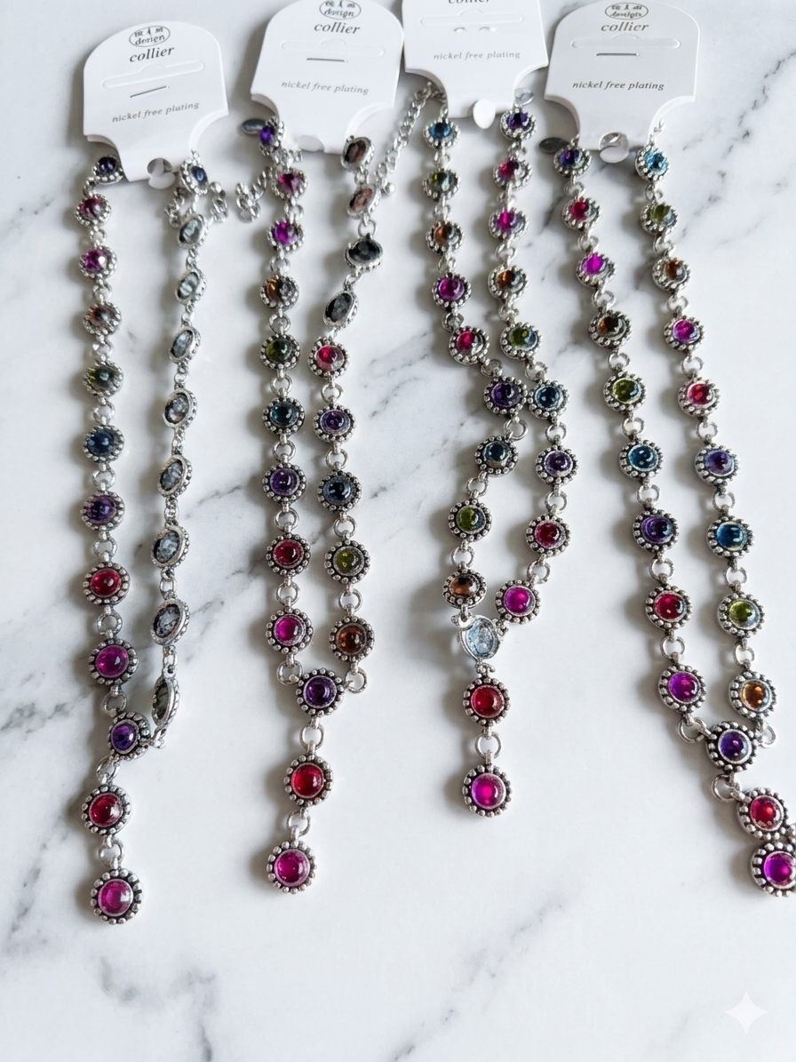 errijk uw collectie met deze prachtige set van 4 boho-chic colliers. Deze kettingen zijn een absolute eyecatcher door de rijke variatie aan gekleurde stenen in een klassieke, zilverkleurige bezel-zetting. De kleurenmix van onder andere fuchsia, saffierblauw, emeraldgroen en amethist-paars geeft de set een luxe en levendige uitstraling die bij vrijwel elke outfit past.