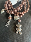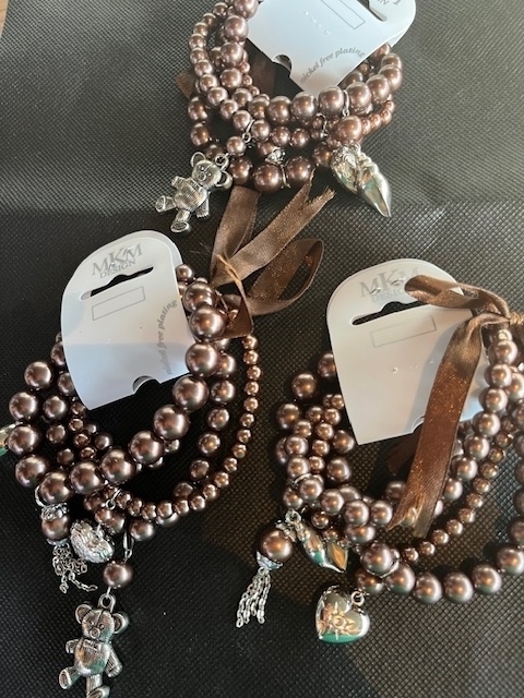 3 keer een set van 4 bruine elastische parel armbandjes met bedeltjes, gebundeld met een leuk lintje