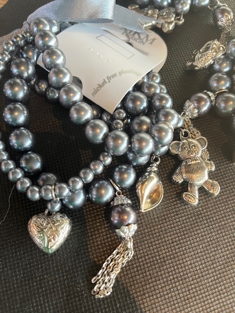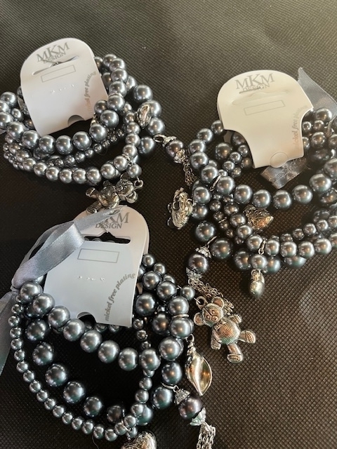 3 keer een set van 4 donker grijze elastische parel armbandjes met bedeltjes, gebundeld met een leuk lintje