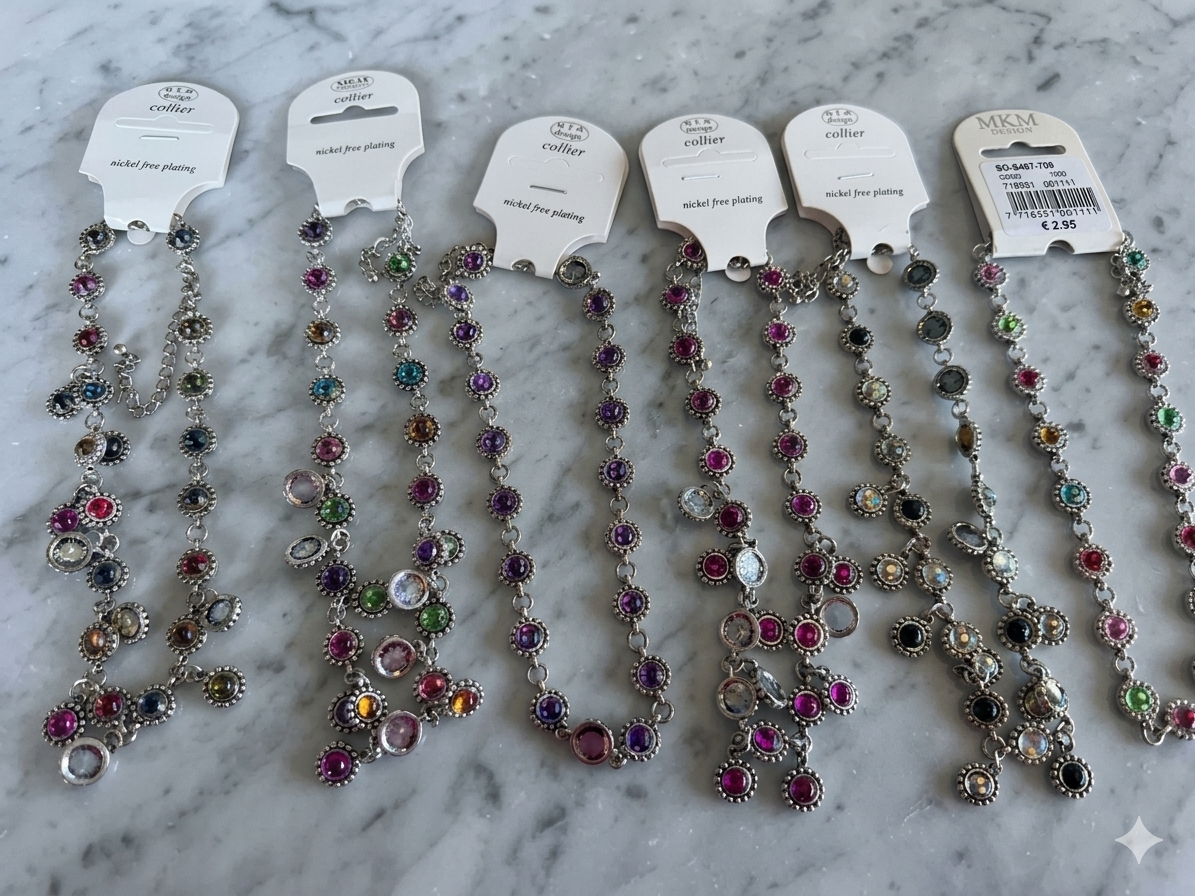 De partij bevat een gevarieerde mix van zilverkleurige colliers, rijkelijk bezet met cabochon-geslepen stenen en speelse bedeltjes in diverse kleuren zoals fuchsia, amethist, emerald en amber. Ideaal voor retailers die hun assortiment willen aanvullen met hoogwaardige eyecatchers tegen een zeer lage inkoopprijs.