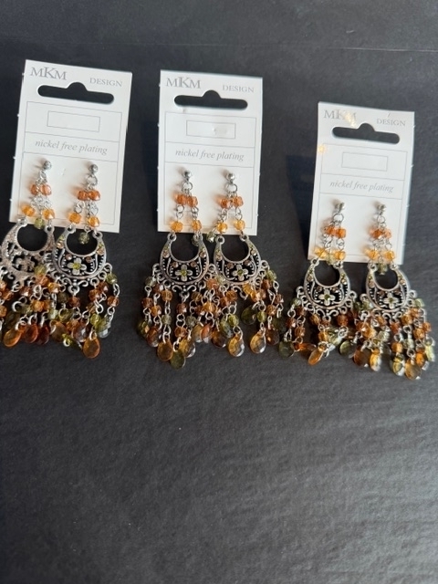Prachtige, sierlijke oorbellen met een zilverkleurige basis en warme tinten kralen (oranje/bruin).