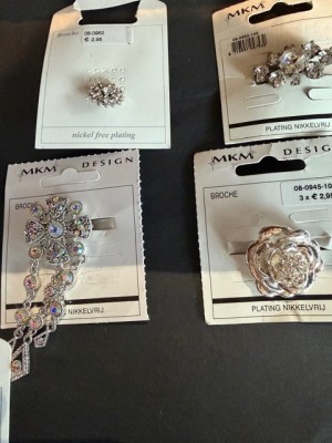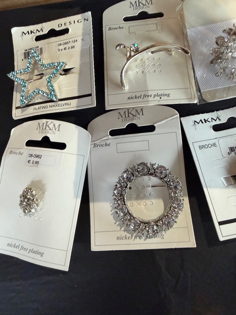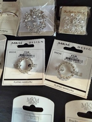 Partij van 14 broche's verschillende maten en soorten met strass en of parels