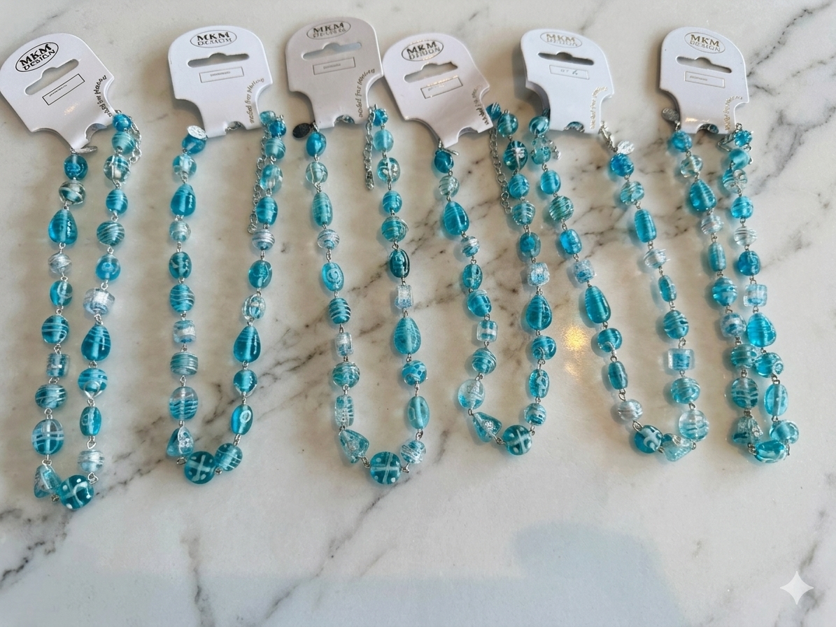 Geef je assortiment een frisse, zomerse impuls met deze set van 6 kralencolliers in schitterende blauwtinten. Deze kettingen vallen op door de unieke combinatie van transparante en bewerkte glaskralen in turquoise en aqua. De subtiele zilverkleurige draadomwikkeling en de organische vormen geven de colliers een ambachtelijke, luxe uitstraling.