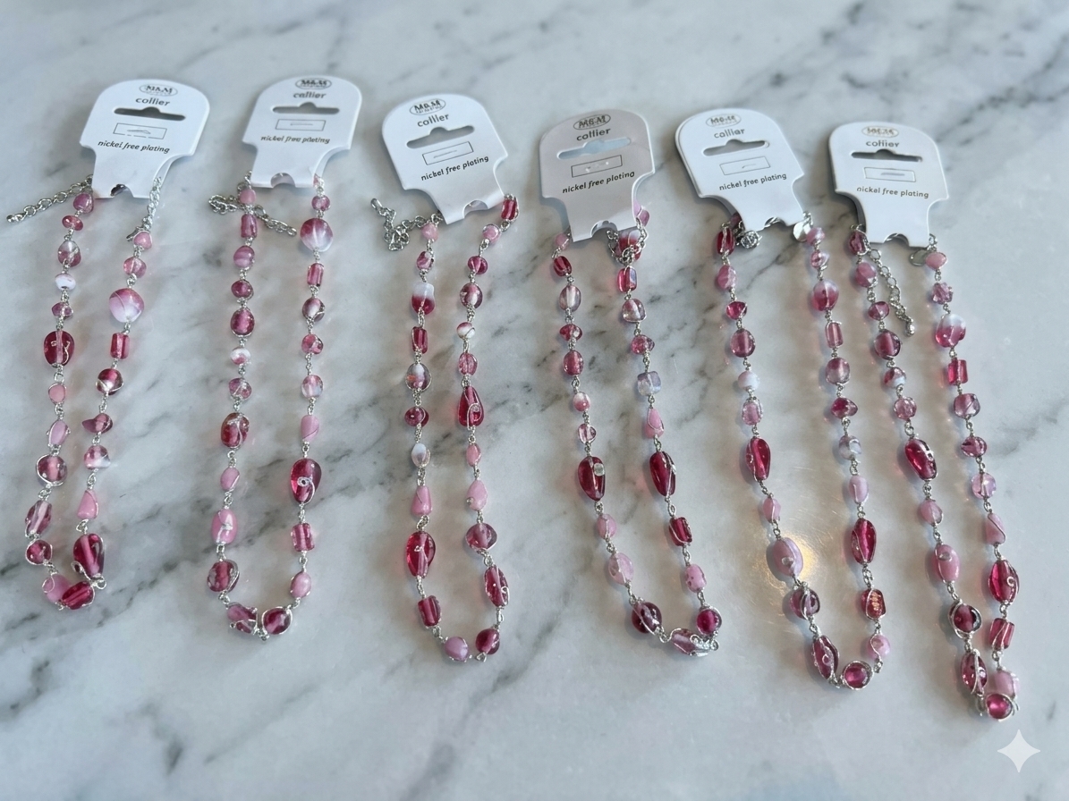 Met een lengte van 45 cm (geopend) vallen deze kettingen prachtig rond de hals. De set biedt een mooie variatie aan roze nuances, waardoor er voor elke klant een passende match is.